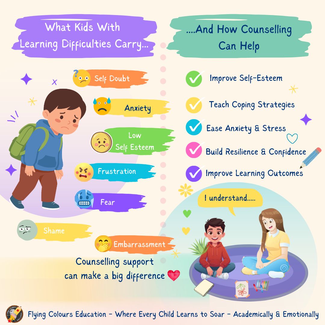 Children with learning difficulties often hold in their feelings. Counselling gives them a safe, non-judgemental space to express emotions such as frustration, anxiety, and self-doubt.